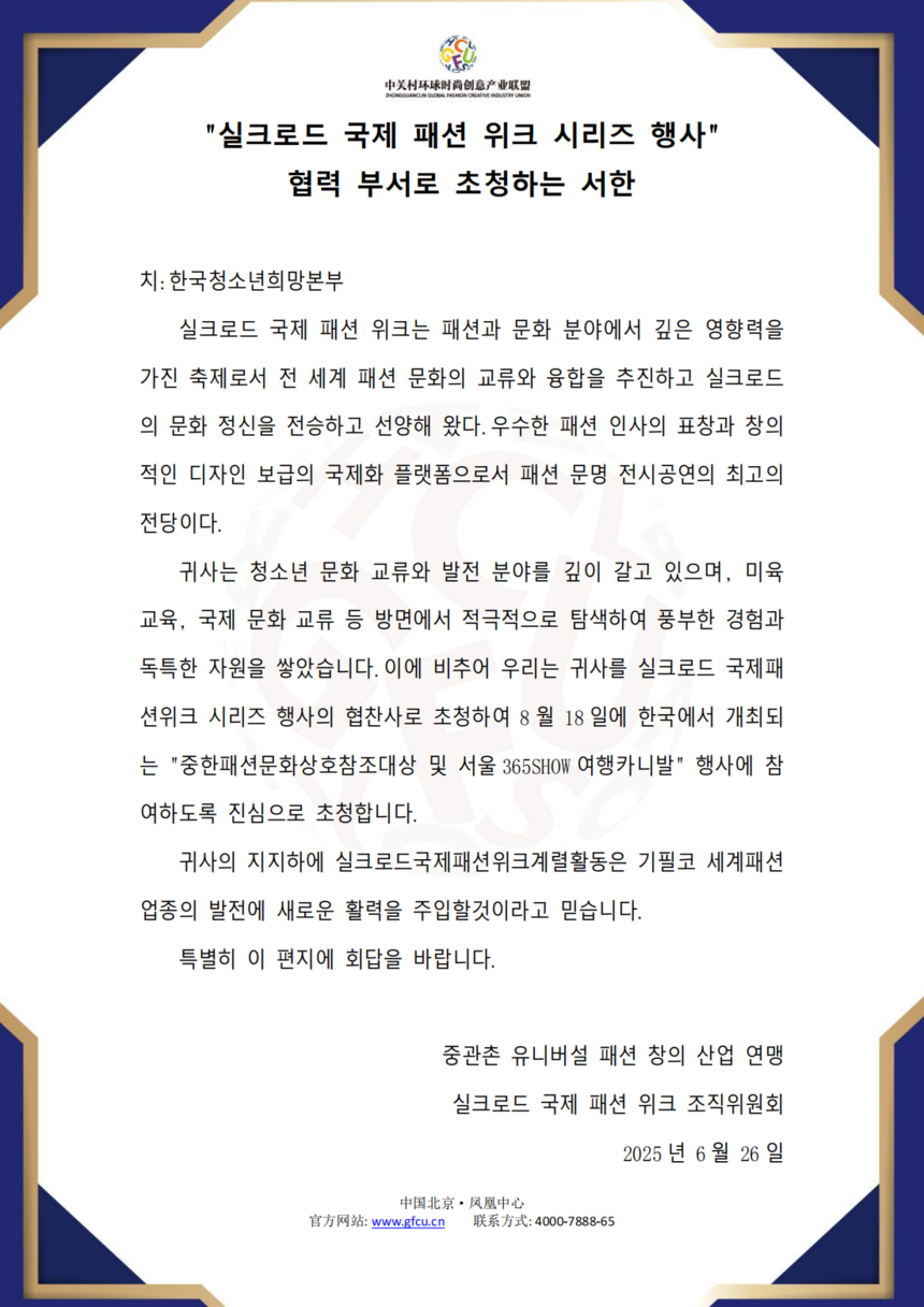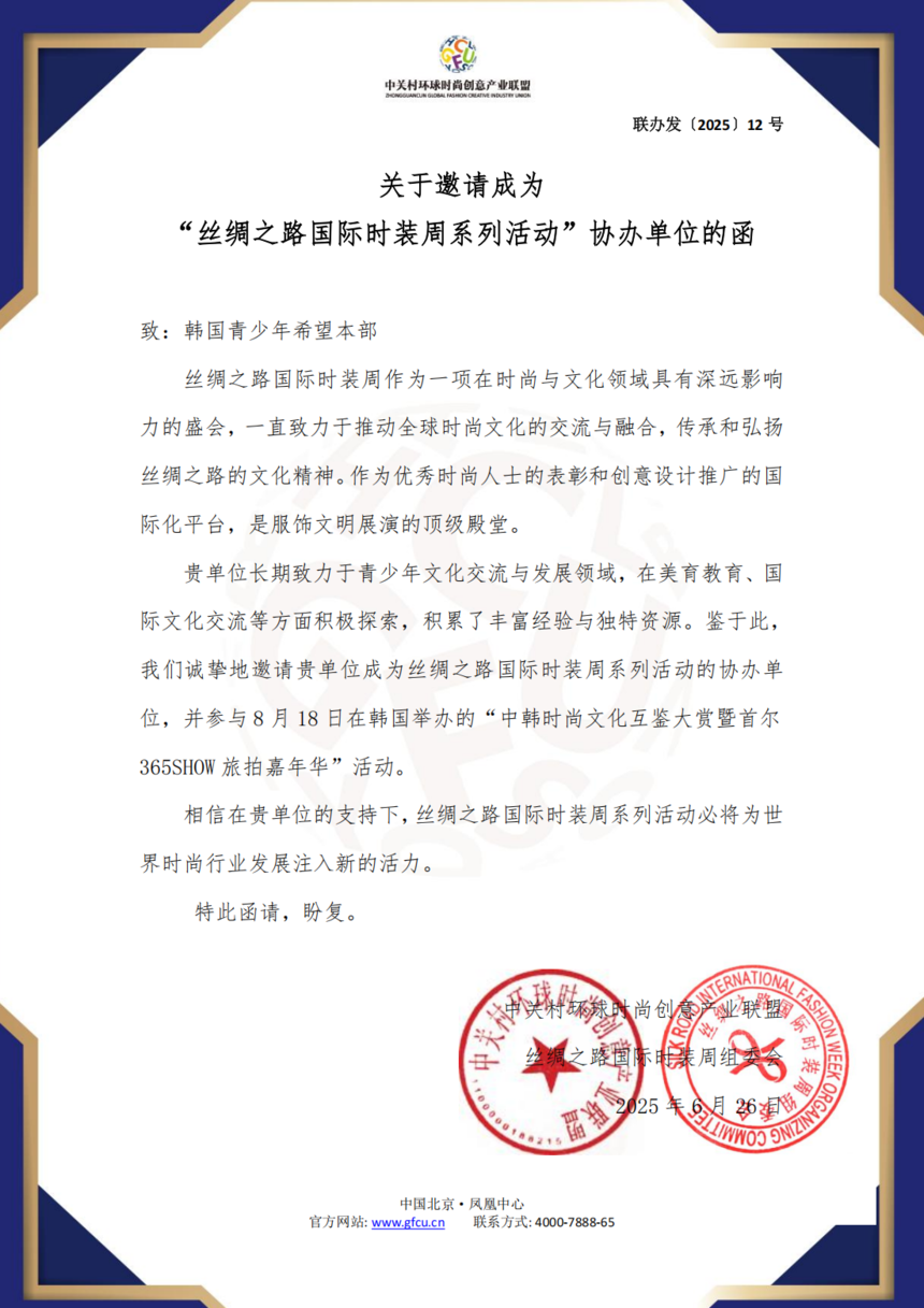 致:韩国青少年希望本部 丝绸之路国际时装周作为一项在时尚与文化领域具有深远影响力的盛会,一直致力于推动全球时尚文化的交流与融合,传承和弘扬丝绸之路的文化精神。作为优秀时尚人士的表彰和创意设计推广的国际化平台,是服饰文明展演的顶级殿堂。 贵单位长期致力于青少年文化交流与发展领域,在美育教育、国际文化交流等方面积极探索,积累了丰富经验与独特资源。鉴于此,我们诚挚地邀请贵单位成为丝绸之路国际时装周系列活动的协办单位,并参与8月18日在韩国举办的“中韩时尚文化互鉴大赏暨首尔365SHOW旅拍嘉年华”活动。 相信在贵单位的支持下,丝绸之路国际时装周系列活动必将为世界时尚行业发展注入新的活力。