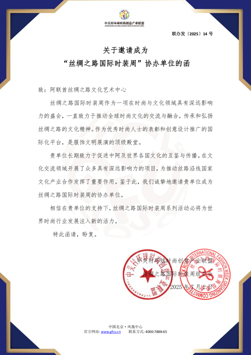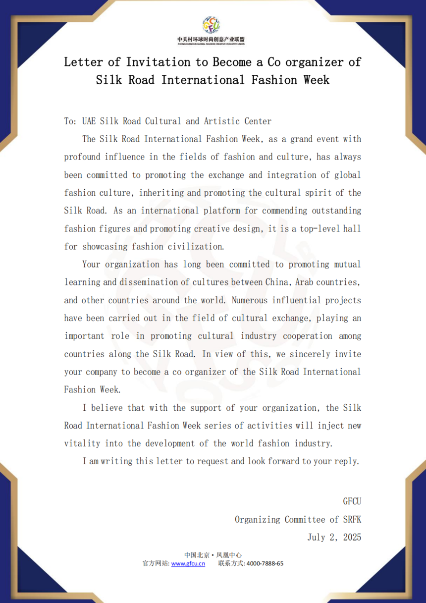 致:阿联酋丝绸之路文化艺术中心 丝绸之路国际时装周作为一项在时尚与文化领域具有深远影响力的盛会,一直致力于推动全球时尚文化的交流与融合,传承和弘扬丝绸之路的文化精神。作为优秀时尚人士的表彰和创意设计推广的国际化平台,是服饰文明展演的顶级殿堂。 贵单位长期致力于促进中阿及世界各国文化的互鉴与传播。在文化交流领域开展了众多具有深远影响力的项目,为推动丝路沿线国家文化产业合作发挥了重要作用。鉴于此,我们诚挚地邀请贵单位成为丝绸之路国际时装周的协办单位。 相信在贵单位的支持下,丝绸之路国际时装周系列活动必将为世界时尚行业发展注入新的活力。 特此函请,盼复。
